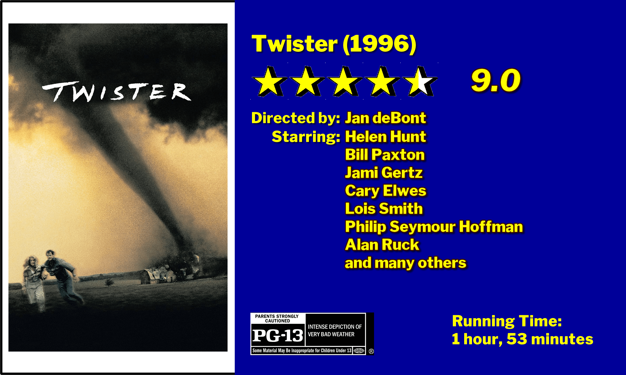 One of the things that gets me about movie reviews is that every thing has to be so subjective. In the case of this little movie, the subjective complaint is PLOT, PLOT, PLOT. A couple of things. First, when a latter-day movie has the name of Twister, what do you expect? A Long Day’s Journey Into Night? Schindler’s List? I think not. This movie is for escapism and it should be judged in that context.